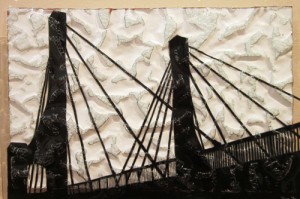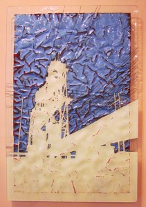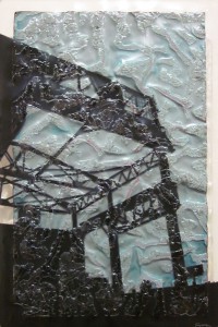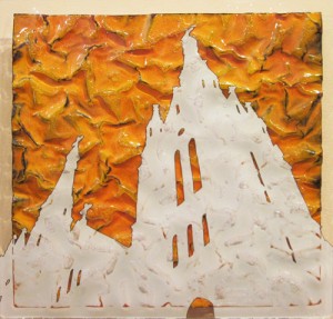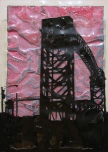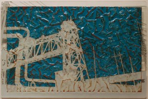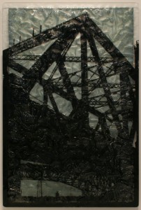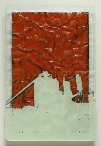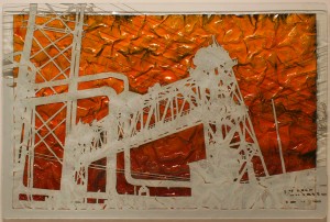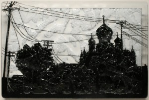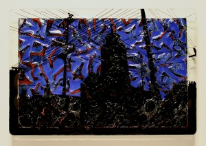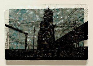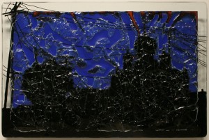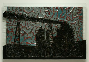 Trained at the Cleveland Institute of Art, Scott Goss works in the field of glass—painting, engraving, fusing and firing pieces with copper. When fired, his glass works take on a new life beyond the sum of their parts. Like the materials used to render them, Goss’s urban landscapes gain a beauty through his depiction that is not at first readily apparent.