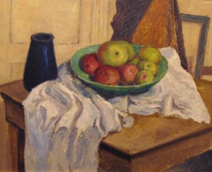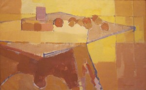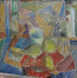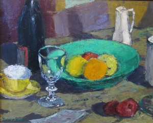 "Still Life with Fruit" Oil on Board Framed, 24" x 27.5" Herdis Gelardi studied under Immanuel Ibsen and produced mainly urban scenes and still lifes. She frequently used bold, saturated color and her still lifes often show the influence of Cezanne. Gelardi exhibited extensively and is represented in several public collections in Denmark. $1400